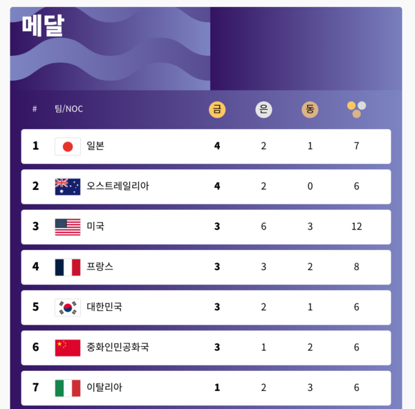 한국 대표팀, 29일 오전 8시 기준 금3, 은2, 동1개로 종합 5위