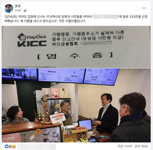 333잔의 의미는 혁신당이 원내 3당인것과 조 전 대표가 기호 3번인 혁신당을 기억해달라는 의미를 담아 333잔을 결제했다고 알려졌다.