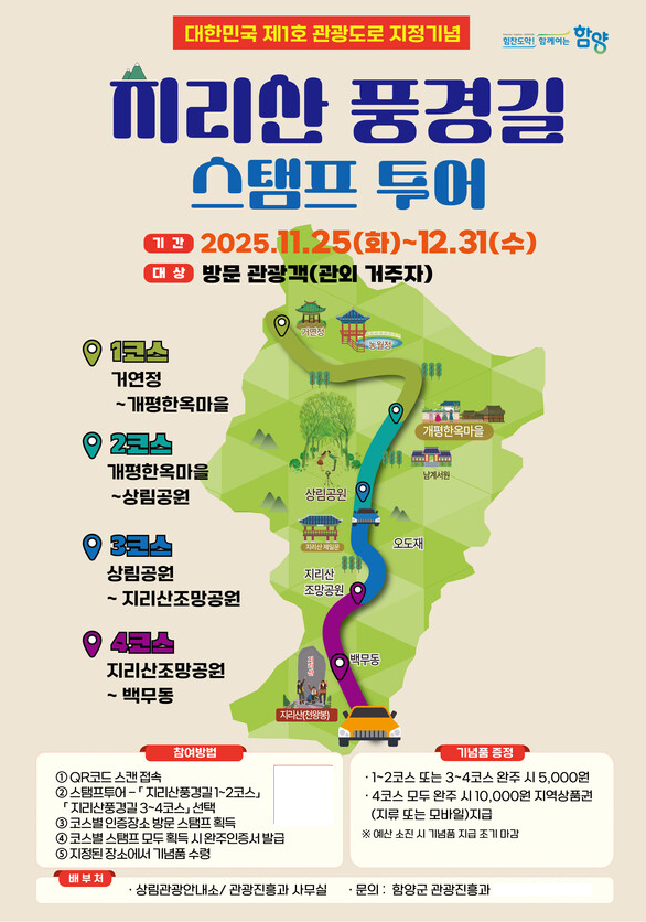 함양군 관계자는 “대한민국 제1호 관광도로라는 상징성을 널리 알리고, 누구나 쉽고 재미있게 참여할 수 있는 체험 관광을 제공하고자 이번 스탬프 투어를 준비했다”며 “많은 분이 지리산 풍경길의 매력을 직접 체험해 보시기 바란다”고 전했다.